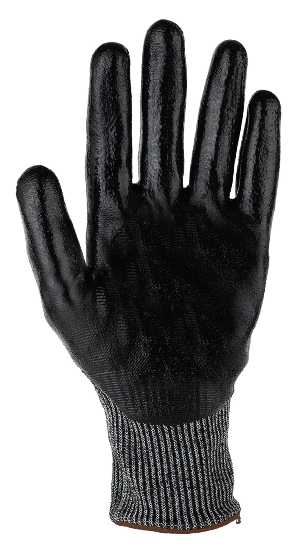 13-as kötésű szürke, varrás nélküli HPPE, acélszál, spandex, PES alapanyagú kesztyű tenyerén fekete sima nitril tenyérbevonattalKötött mandzsetta.