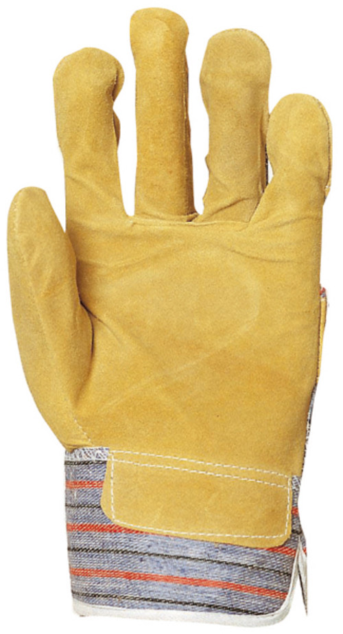 Sárga marhahasíték rakodó kesztyű pamut bélésű tenyérrel, vászon kézháttal és mandzsettával7,5cm-es biztonsági mandzsettával