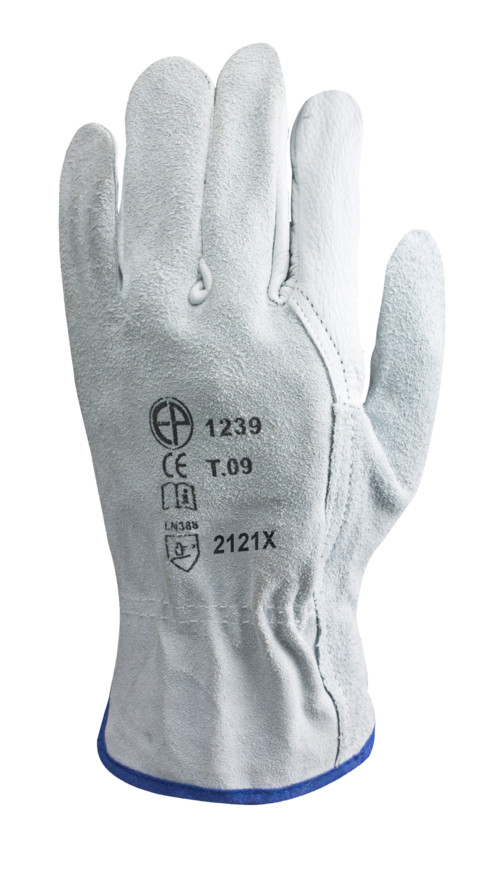 * szürke bivalybőr tenyér* marhahasíték kézhát* felső csuklógumírozás* nagy igénybevételre tervezett, komfortos védőkesztyűEN 388:2016 2121x
