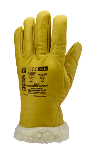 Sárga színmarhabőr kesztyű, műszőrme béléssel.Gumírozott a tenyéren, biztonsági mandzsettával (32cm teljes hossz)