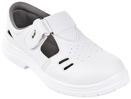* fémmentes, tépőzáras védőszandál , folyadékoknak jobban ellenálló, kiválóan szellőző fehér mikroszálas felsőrésszel* antisztatikus, olajálló, hajlékony, kétrétegű, fehér PU talp, ütődéselnyelő sarokkal * nedves acél és kerámia felületekre bevizsgált, SRC fokú csúszás elleni védelem, kényelmes talpbélés * könnyű súlyú, egészségügyi, élelmiszeripari munkákhoz, egész napos viseletre ajánlott védőlábbeli * szivaccsal párnázott bokarész, szellőzőnyílások