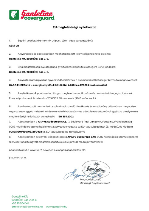 * 12 mm átmérőjű, 200 mm hosszú, piros, állítható hosszúságú körszövött kötél energiaelnyelővel * a polietilén védőréteggel bevont szalag össze van hajtogatva és biztonsági varrással többszörösen összetűzve (ennek lebomlása emészti fel a zuhanás energiáját) * statikai szilárdsága 15 kN, dinamikus fékereje maximum 6 kN (ennél nagyobb erőhatás nem érheti a zuhanás megállításakor a használót) * egy csavarmenetes (AZ011), egy rugós (AZ002) karabinerrel, teljes hossza 2,0 m