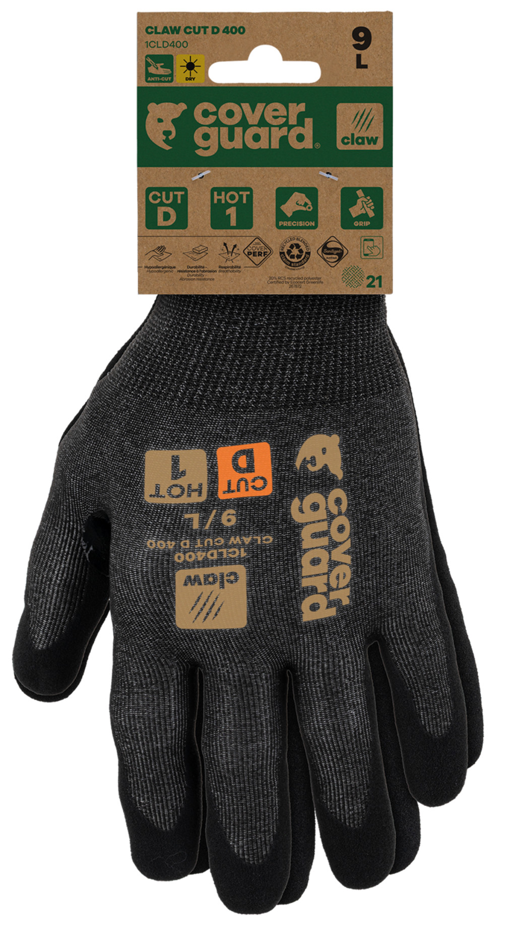 A CLAW CUT termékcsalád egy új generációs vágásálló kesztyű, amelyet arra terveztek, hogy megvédjen a legigényesebb munkák során, magas vágásállósággal (CUT D-től A9-ig), és kiváló komfortot, valamint kivételes ügyességet biztosítson minden munkakörnyezetben (száraz, nedves és olajos).A CLAW CUT D 400 modellt finom anyagmozgatási munkákhoz tervezték száraz és enyhén olajos környezetben. A magas 21-es kötés, amely egy rendkívül puha és erős üvegszál, poliészter és spandex alapú anyagból készült, második bőr érzést biztosít, miközben kiváló vágásvédelmet nyújt (CUT D).A sandy nitril bevonat és a hosszú megerősítés a hüvelykujj és a mutatóujj között kiváló tapadást és jó fogást biztosít. Ez a bevonat nagyon jó légáteresztőséget garantál (COVERPERF címkével tesztelve), valamint nagy kopásállóságot is (COVERPERF címke: >20.000 ciklus). A CLAW CUT D 400 újrahasznosított poliészterből készült, és RCS tanúsítvánnyal rendelkezik (a termék teljes súlyának 20%-a). Üvegszál nélkül.Ez a kesztyű érintőképernyő kompatibilis, így viselése közben is használhatja a kijelzővel rendelkező berendezéseket. A Sanitized kezelés megakadályozza a baktériumok és szagok fejlődését, és a CLAW CUT D 400 hypoallergén is (COVERPERF SKINCARE teszt).