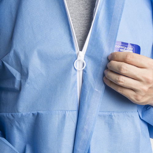 * CoverPro 5S11 kék színű, három rétegű, kapucnis könnyű (50 g/m2) antisztatikus, SMS polipropilén overál* porok, folyadékpermetek, fröccsenő vegyszerek, továbbá radioaktív szennyeződésű részecskék elleni védelem* gumizott derék-, arc-, csukló- és bokarész, védőhajtókával ellátott cipzár* III. védelmi kategória, 5. és 6. típus