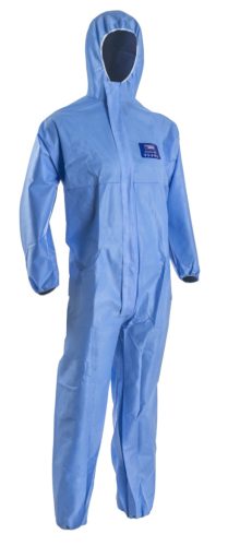 * CoverPro 5S11 kék színű, három rétegű, kapucnis könnyű (50 g/m2) antisztatikus, SMS polipropilén overál* porok, folyadékpermetek, fröccsenő vegyszerek, továbbá radioaktív szennyeződésű részecskék elleni védelem* gumizott derék-, arc-, csukló- és bokarész, védőhajtókával ellátott cipzár* III. védelmi kategória, 5. és 6. típus