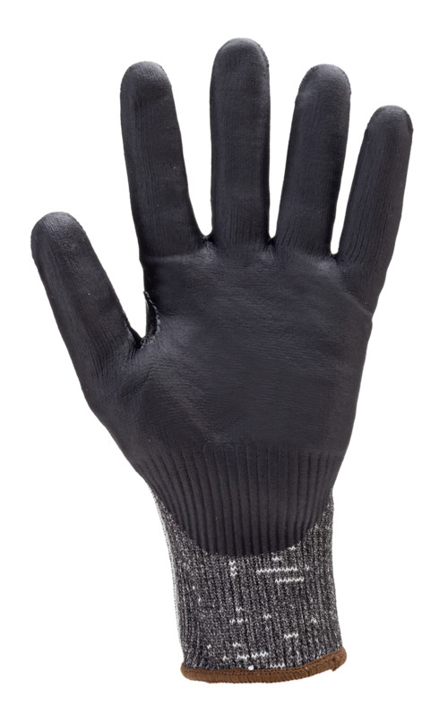 Fekete HDPE-vel, poliamiddal és elasztánnal erősített 13-mas kötésű kesztyű fekete nitril habbal mártott tenyérrel.Nitrillel megerősített hajlat a hüvelyk és mutatóujj között.Kötött mandzsetta.