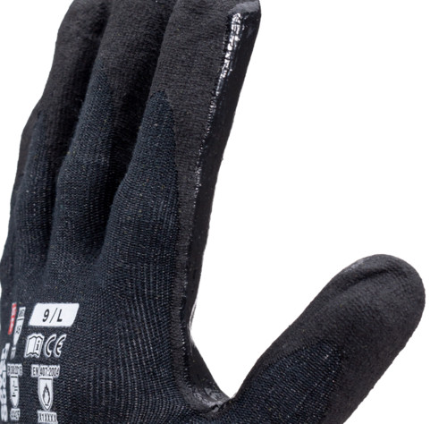 Fekete HDPE-vel, kevlárral és spandex-el erősített 18-as fonású kesztyű. Fekete nitril mikro habbal erősített tenyér. Erősített a hüvelyk és mutató ujjnál.Fertőtlenített: Megakadályozza a baktériumok és a kellemetlen szagok kialakulását.Kötött mandzsetta