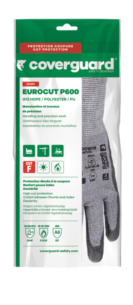Szürke, HDPE-vel erősített kesztyűTenyerén fekete kopásálló PU mártásNitril megerősítés a mutató- és hüvelykujj közöttMinősítéssel OEKO-TEX® STANDARD 100, CQ 1301/1, IFTH