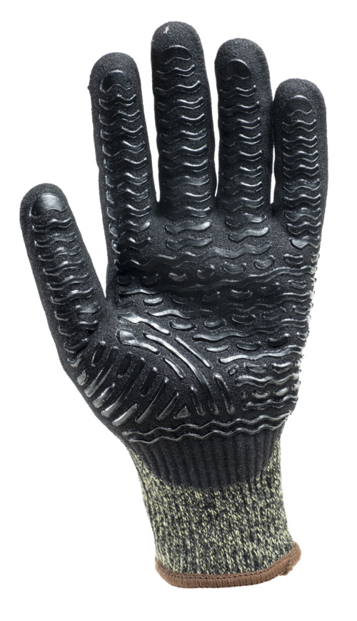 EUROHEAT CUT F 10-es kötésű, varrás nélküli sárga és fekete foltos kötött védőkesztyű, poli-pamut és aramid alapanyagból. Dupla rétegű mártás a tenyéren: sima nitril és sandy csúszásbiztos felülettel, illetve hullámmintás PVC pettyezéssel.
