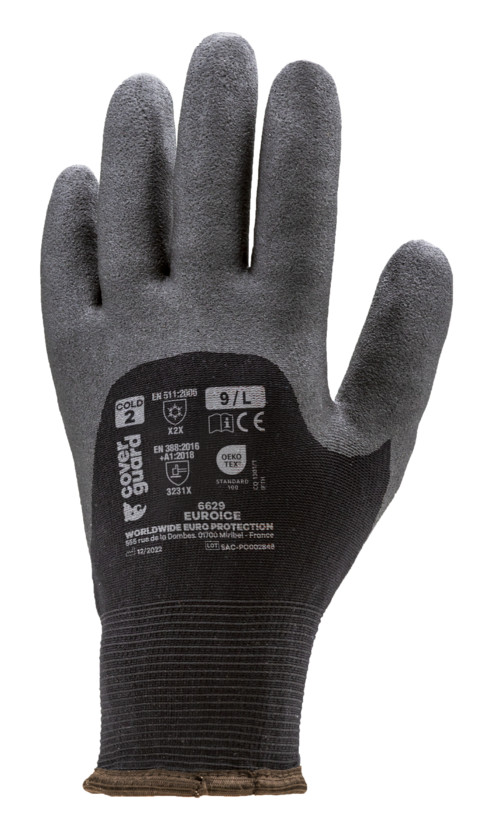Fekete, varrás nélküli, poliamiddal erősített, 15-ös kötésű kesztyűFekete akril bélésselFekete PVC-HTP habbal az ökölcsontigKötött mandzsettávalMinősítéssel OEKO-TEX® STANDARD 100, CQ 1301/1, IFTH