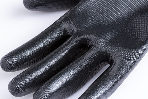 * Varrás nélküli szürke poliészter kesztyű, 13-as kötéssel.* Fekete sima nitril bevonat a tenyérrészen és a hüvelykujjnál a kéz fokozottabb védelme érdekében.* Kötött mandzsetta