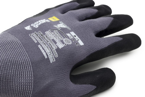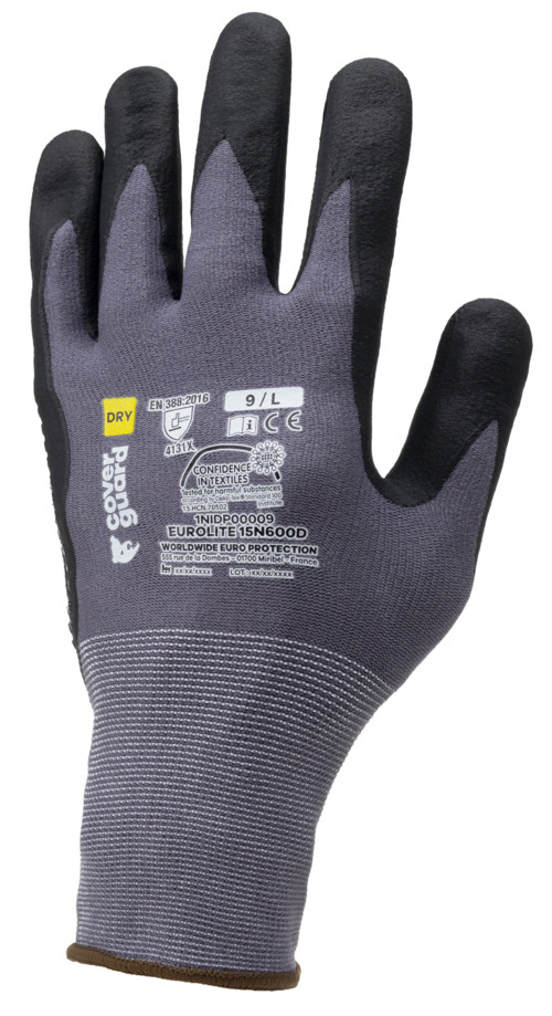 Szürke, varrás nélküli, poliamiddal megerősített, 15-ös kötésű kesztyű, tenyerén nitril mikro-habbal és pettyezve, kötött mandzsettával.A tenyér nitril alapanyagának köszönhetően enyhén olajálló tulajdonsággal rendelkezikOEKO-TEX® STANDARD 100 minősítés , CQ 1301/1, IFTH vagy 15.HCN.70502, HOHENSTEIN