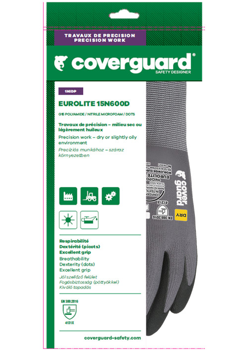 Szürke, varrás nélküli, poliamiddal megerősített, 15-ös kötésű kesztyű, tenyerén nitril mikro-habbal és pettyezve, kötött mandzsettával.A tenyér nitril alapanyagának köszönhetően enyhén olajálló tulajdonsággal rendelkezikOEKO-TEX® STANDARD 100 minősítés , CQ 1301/1, IFTH vagy 15.HCN.70502, HOHENSTEIN