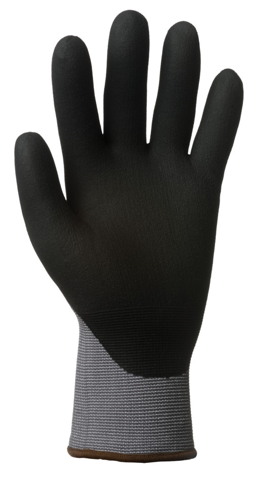 Szürke, varrás nélküli, poliamidal erősített, 15-ös kötésű kesztyű, fekete nitril habbal mártott tenyérrel és kötött mandzsettávalOEKO-TEX® STANDARD 100 minősítés, CQ 1301/1, IFTH vagy 15.HCN.70502, HOHENSTEIN