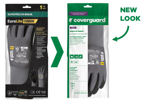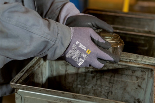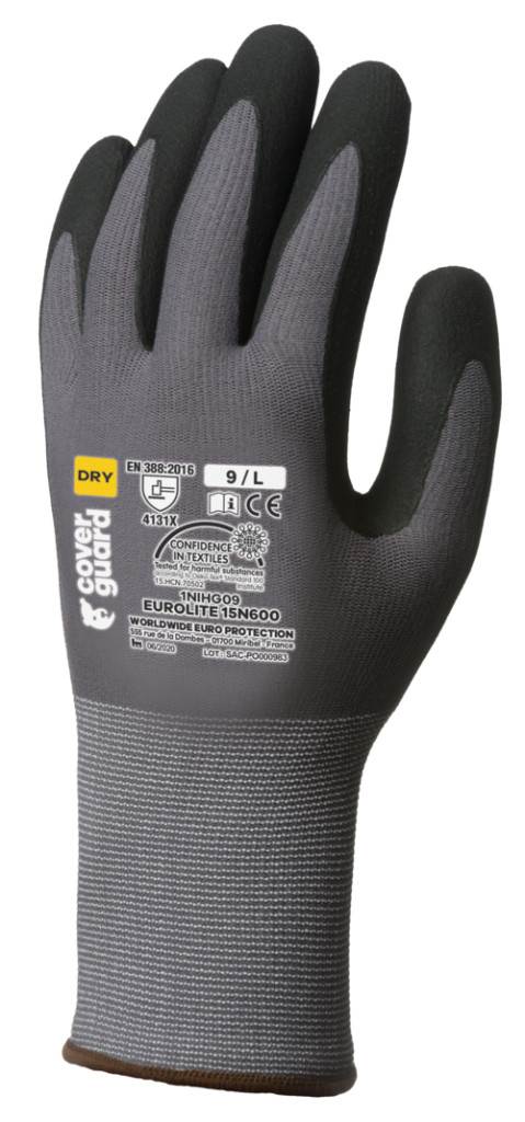 Szürke, varrás nélküli, poliamidal erősített, 15-ös kötésű kesztyű, fekete nitril habbal mártott tenyérrel és kötött mandzsettávalOEKO-TEX® STANDARD 100 minősítés, CQ 1301/1, IFTH vagy 15.HCN.70502, HOHENSTEIN