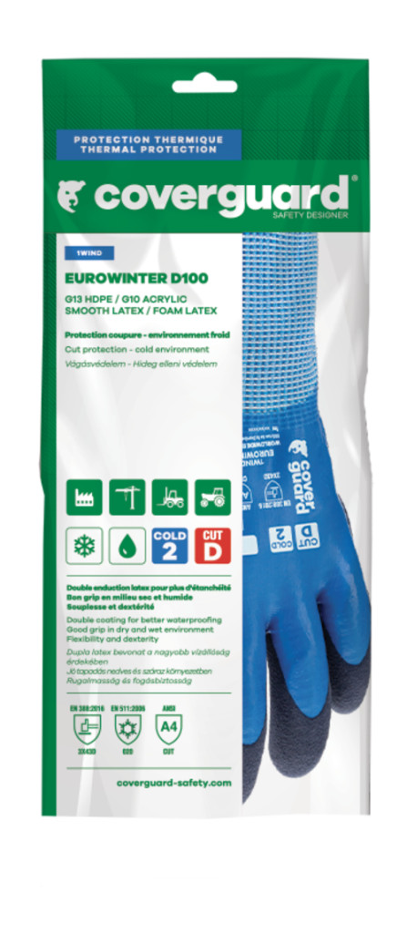 Világoskék, varrás nélküli HDPE-vel erősített kesztyű, szürke frottír béléssel.Duplán mártott: egy sima réteg kék latex a teljes felületen, egy sötét kék latex hab tenyérrész illetve ujjakErgonomikus kialakításKötött mandzsetta