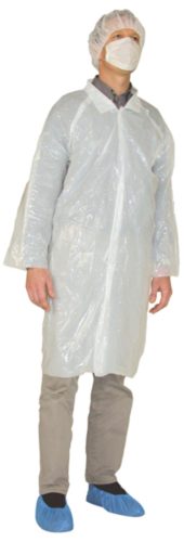 * fehér színű pe látogatóköpeny* hossza 110 cm* vastagsága 20 mikron* patentos záródás