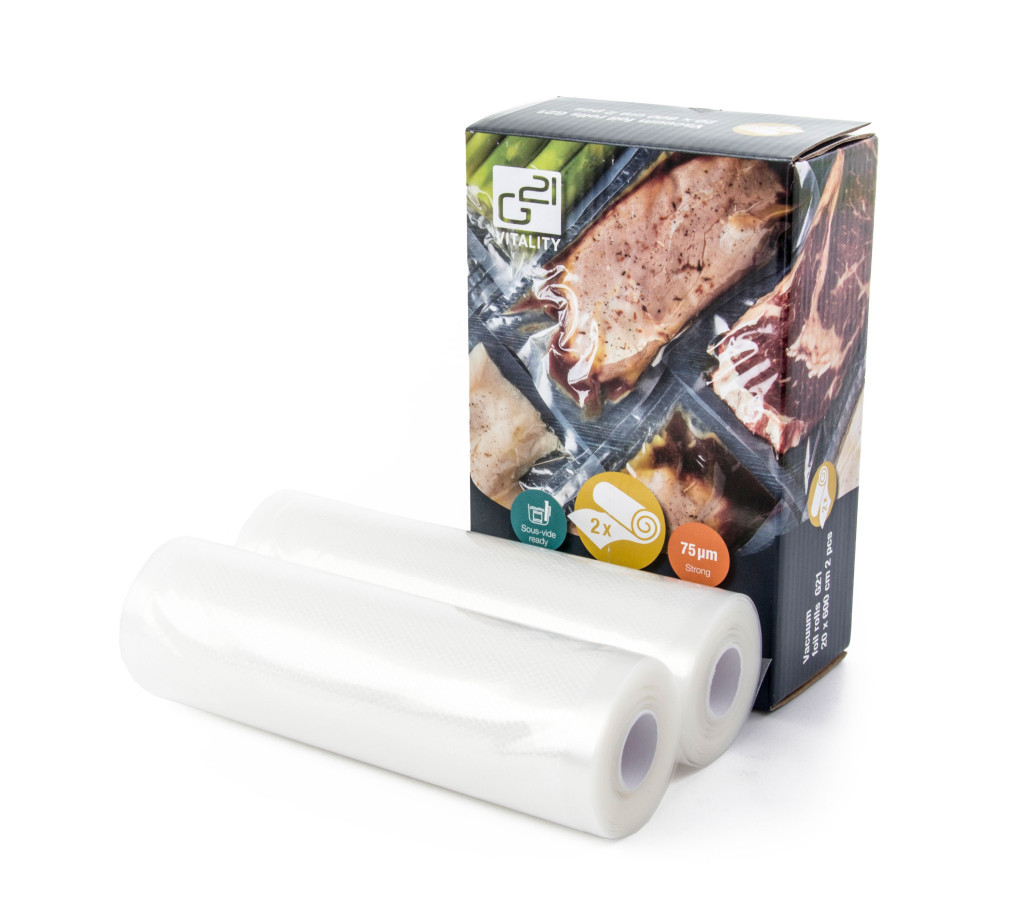 Jó minőségének és nagyszerű kialakításának köszönhetően a 600 x 20 cm méretű G21 vákuumtekercs nemcsak az élelmiszerek eltarthatóságának meghosszabbítására, de a hűtőszekrényben, vagy a fagyasztóban történő tárolására is alkalmas. Felhasználható a sous-vide főzéshez is.Minőségi, szilárd anyagA G21 vákuumfólia nagy előnye, hogy egészségbarát, szilárd anyagból készül. Ha a vákuumozáshoz a G21 Onyx vagy G21 Nefrit gépet használja, melyek dupla huzalú forrasztással biztosítják a csomagolás zárását, biztos lehet benne, hogy a vákuumfólia, magas szakítószilárdságának köszönhetően nem szakad el, valamint nem fog ereszteni. Ezáltal biztonságosan feldolgozhatja az ételeket.A fólia felületeA minőségi G21 fóliákat a sokoldalúság érdekében kétféle felülettel láttuk el. A külső felülete az egyik oldalról sima és a másikról recés, tehát a fóliát minden típusú vákuumozó gépben használhatja (amenniyben megfelelnek az adott méreteknek).A belső felülete is hasonlóan van megoldva - az egyik oldala enyhén recés, tehát a G21 vákuumozó fóliákat nem csak szilárd és ömlesztett nyersanyagok vákuumozására használhatja, hanem bepácolt élelmiszerekre is. Amennyiben a belső felület sima lenne, a vákuumozó gép kiszívná a levegővel a pácot is, ami nem éppen a cél.A fólia egyik belső oldalán lévő recés felületnek köszönhetően a pác egyenletesen eloszlik a belsejében és a bepácolt hús vagy zöldség tökéletesen magukba szívja a pác összes aromáját.Könnyen, egyszerűen kezelhetőA G21 vákuumfólia másik nagy előnye könnyed, egyszerű kezelhetősége. Egyszerűen csak helyezze be az alapanyagokat a fóliába és vákuumozza le. Ennyire egyszerű.A G21 vákuumtekercs fő előnyei 20 x 600 cmminőségi, szilárd anyagmagas szakítószilárdság, használhatja akár sous-vide főzéshez iskönnyű és gyors kezeléstöbbszöri, ismételt felhasználás