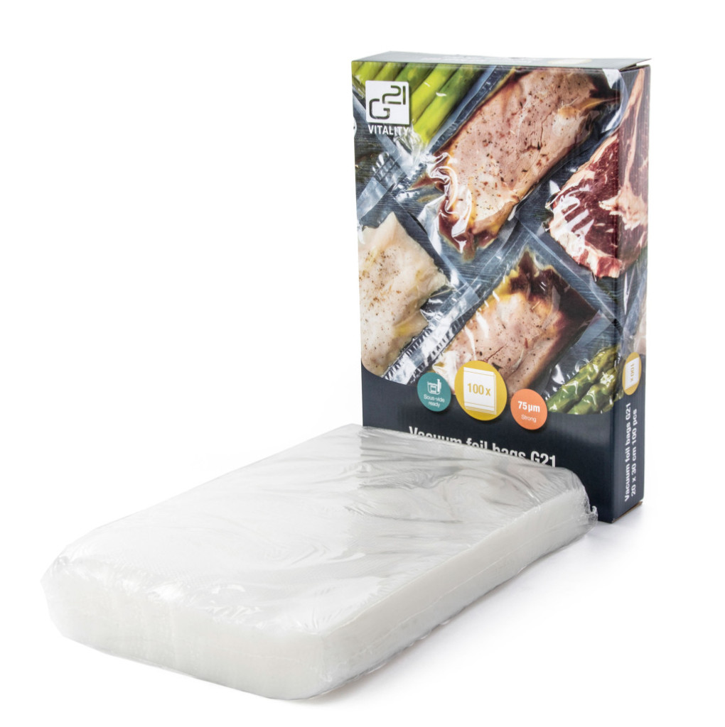 Jó minőségének és nagyszerű kialakításának köszönhetően a 20 x 30 cm méretű G21 vákuumzacskó nemcsak az élelmiszerek eltarthatóságának meghosszabbítására, de a hűtőszekrényben, vagy a fagyasztóban történő tárolására is alkalmas. Felhasználható a sous-vide főzéshez is.Minőségi, szilárd anyagA G21 vákuumzacskó nagy előnye, hogy egészségbarát, szilárd anyagból készül. Ha a vákuumozáshoz a G21 Onyx vagy G21 Nefrit gépet használja, melyek dupla huzalú forrasztással biztosítják a csomagolás zárását, biztos lehet benne, hogy a vákuumfólia, magas szakítószilárdságának köszönhetően nem szakad el, valamint nem fog ereszteni. Ezáltal biztonságosan feldolgozhatja az ételeket.A fólia felületeA minőségi G21 fóliákat a sokoldalúság érdekében kétféle felülettel láttuk el. A külső felülete az egyik oldalról sima és a másikról recés, tehát a fóliát minden típusú vákuumozó gépben használhatja (amenniyben megfelelnek az adott méreteknek).A belső felülete is hasonlóan van megoldva - az egyik oldala enyhén recés, tehát a G21 vákuumozó fóliákat nem csak szilárd és ömlesztett nyersanyagok vákuumozására használhatja, hanem bepácolt élelmiszerekre is. Amennyiben a belső felület sima lenne, a vákuumozó gép kiszívná a levegővel a pácot is, ami nem éppen a cél.A fólia egyik belső oldalán lévő recés felületnek köszönhetően a pác egyenletesen eloszlik a belsejében és a bepácolt hús vagy zöldség tökéletesen magukba szívja a pác összes aromáját.Könnyen, egyszerűen kezelhetőA G21 vákuumzacskó másik nagy előnye könnyed, egyszerű kezelhetősége. Egyszerűen csak helyezze be az alapanyagokat a fóliába és vákuumozza le. Ennyire egyszerű.A G21 vákuumzacskó fő előnyei 20 x 30 cmminőségi, szilárd anyagmagas szakítószilárdság, használhatja akár sous-vide főzéshez iskönnyű és gyors kezeléstöbbszöri, ismételt felhasználás