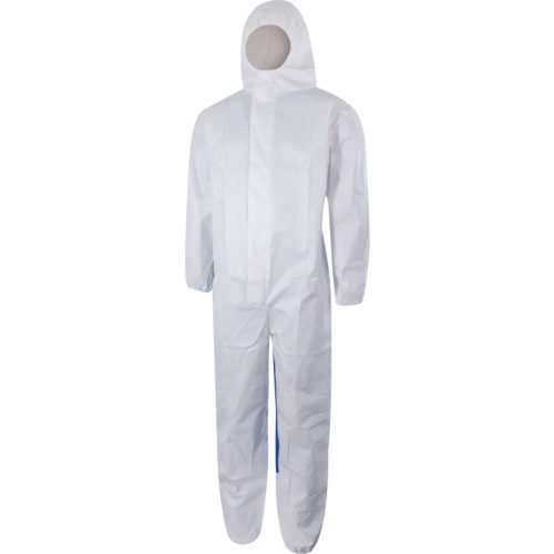 Kettős, 5-ös és 6-os típusú, kapucnis overál. Fehér mikroporózus védő előoldal kék légáteresztő SMS védelmi hátoldallal Nagyobb védelmet nyújt elöl miközben a légáteresztő hátoldali védőpanel a kényelemről gondoskodik A gyémánt alakú berakás a lábak között könnyíti a mozgást miközben erősíti is a ruhát 2 irányú cipzár és öntapadós cipzárvédő elöl Elasztikus mandzsetták a kapucnin a hátrészen és a bokarészen EN ISO 374-5 2006 EN 13034 2005