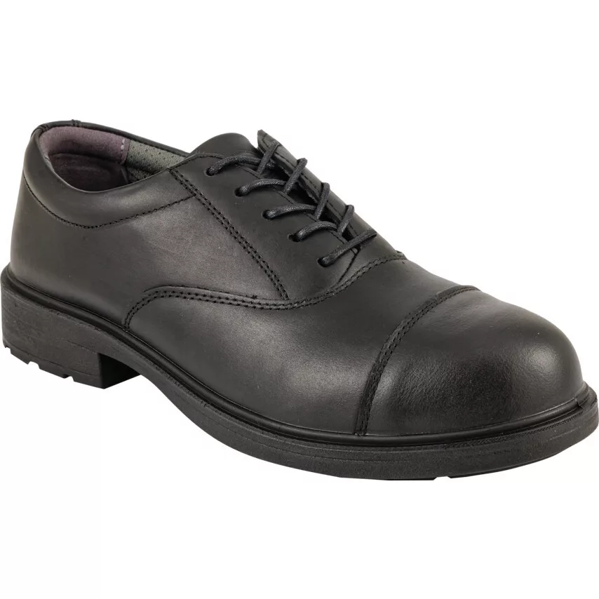 S3 elegáns fekete cipő. Kompozit orrbetét fém biztonsági talpközéppel Teljesen bőr fekete felsőrész Kényelmes talpbetét Energiaelnyelő sarokrész PU járófelület Egy pár tartalék fűző EN ISO 20345 2011