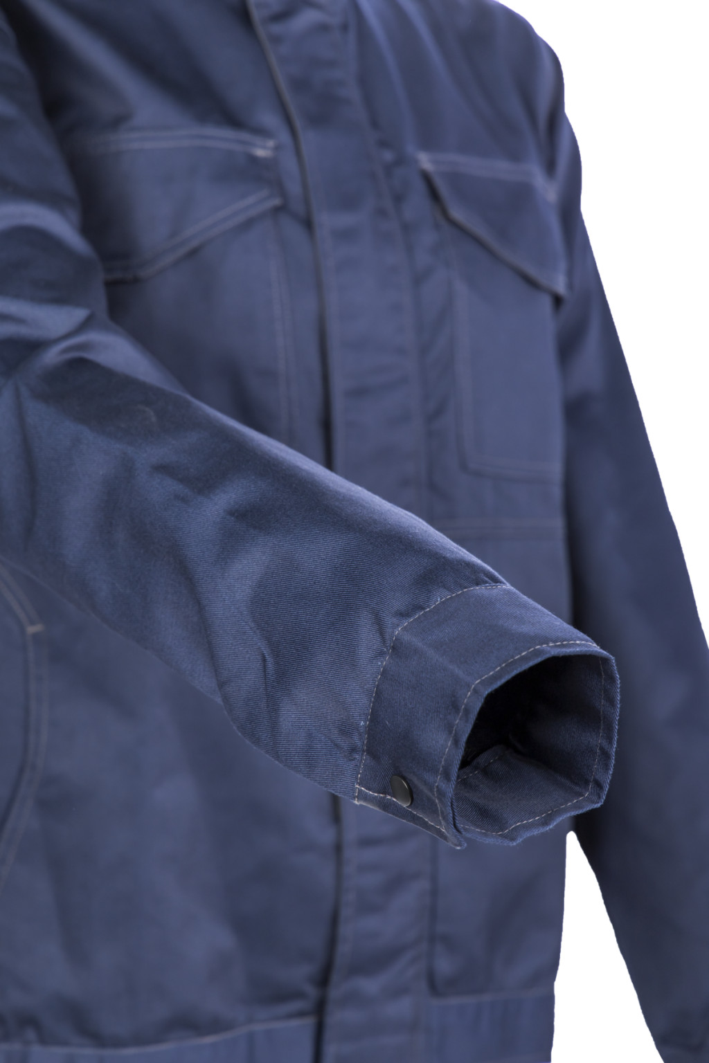 300 g/m2 vastag, kopásálló, sávolykötésű anyag kék színben, 60% pamut, 40% poliészter,ideális intenzív ipari használatra,Egyenes szabású, dzsekifazonú kabát, patenttal állítható mandzsettával és tépőzárral állítható derékkal,Teljesen fémmentes, megerősített váll- és hátrész,Állig érő húzózár, szennyeződésektől védő, tépőzáras cipzárfedővel, álló gallérral, sok zsebbel