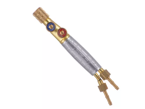 IK-20 vágókiegészítő markolat, fém ház, réz test, két szabályzó szeleppel. RK20, BK20 kompatibilis. Égőgáz 3/8" LH hollander 8mm-es tömlővéggel; oxigén 1/4" hollander 6,3 mm-es tömlővéggel.