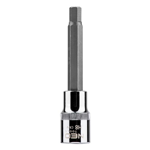 Imbusz bit 1/2 dugókulcson, CrV acél dugókulcs, S2 acél bit NEO 1/2"-os Imbusz bit dugókulcs, 100 mm hosszú, a DIN 7422 szabványnak megfelelő. A dugóadapter nagy ellenállóképességű króm-vanádium acélból készül. A hatlapú bit kiváló minőségű S2 acélötvözetből készül. A szerszám minőségét bizonyítja a TÜV tanúsítvány és a gyártó által nyújtott 25 éves jótállás. A NEO márka a professzionális igényeket is kielégíti.