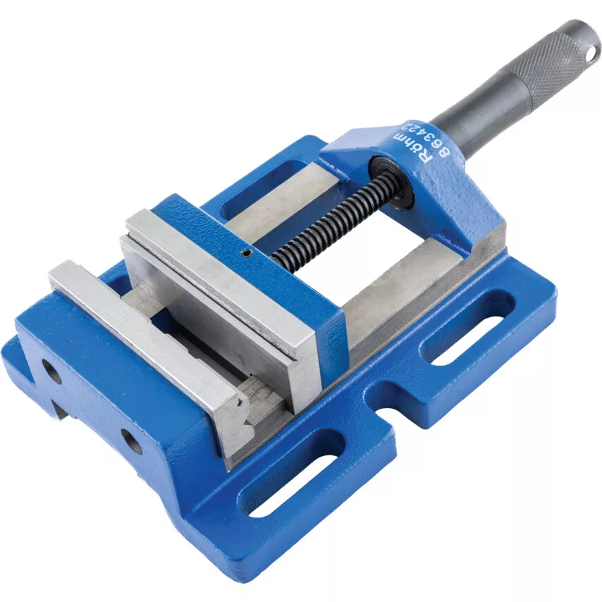 Fúrógép satu. Négy különféle satupofa szélességgel Fúrásra és könnyű maró megmunkálásra függőleges és vízszintes munkákhoz Egy hornyolt és egy sima cserélhető satupofa nem szögletes vagy szabálytalan alakú munkadarabok befogásához A pofák és az orsó edzettek és köszörültek