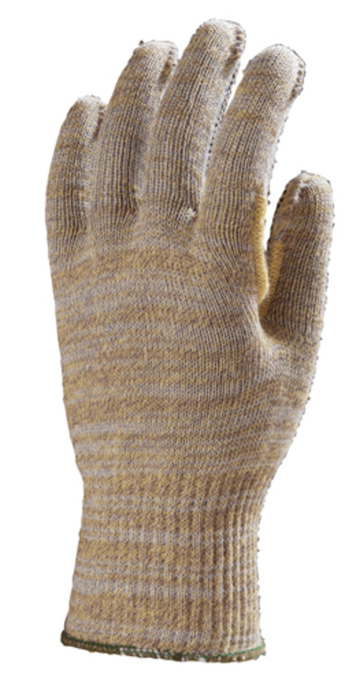 * Multiszálas védőkesztyű* Kívül kopás- és emelt, 5-ös szinten vágásbiztos, hőálló alapanyagok (Kevlar(R)/PA/acél) - Belül komfortos pamut* 27 cm hosszú, gumírozott mandzsetta* tenyerén csúszás ellen mini PVC pöttyök, 100°C kontakt hőhatásnál 15 sec időtartamig nyújt védelmet