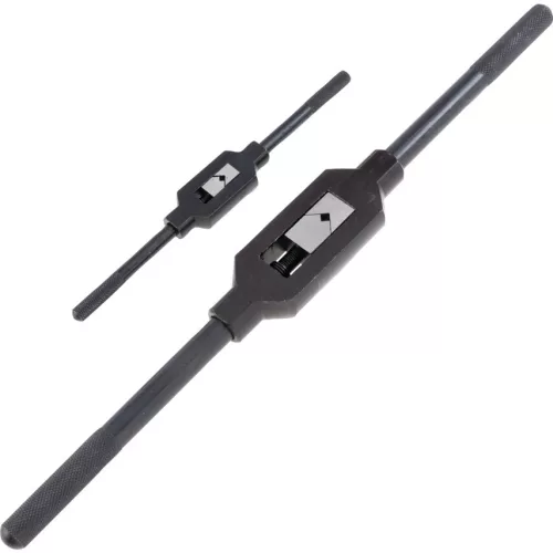 Hagyományos műhely menetfúró hajtóvasak - készlet. Edzett és megeresztett szerszámtest edzett és köszörült szorítópofák tömör konstrukció recézett állítható hajtókarok a jobb szorításhoz Az egyenes szárú kivitel nagyobb erőátvitelt tesz lehetővé mely különösen fontos nagyobb átmérőjű menetfúrók használata esetén Menetfúró méretek az ISO 529 szabvány szerint Menetfúró hajtóvas készlet Tartalma 2 8-5 0 mm és 4 3-14 0 mm négyszög méretű menetfúrók befogására alkalmas hajtóvasak