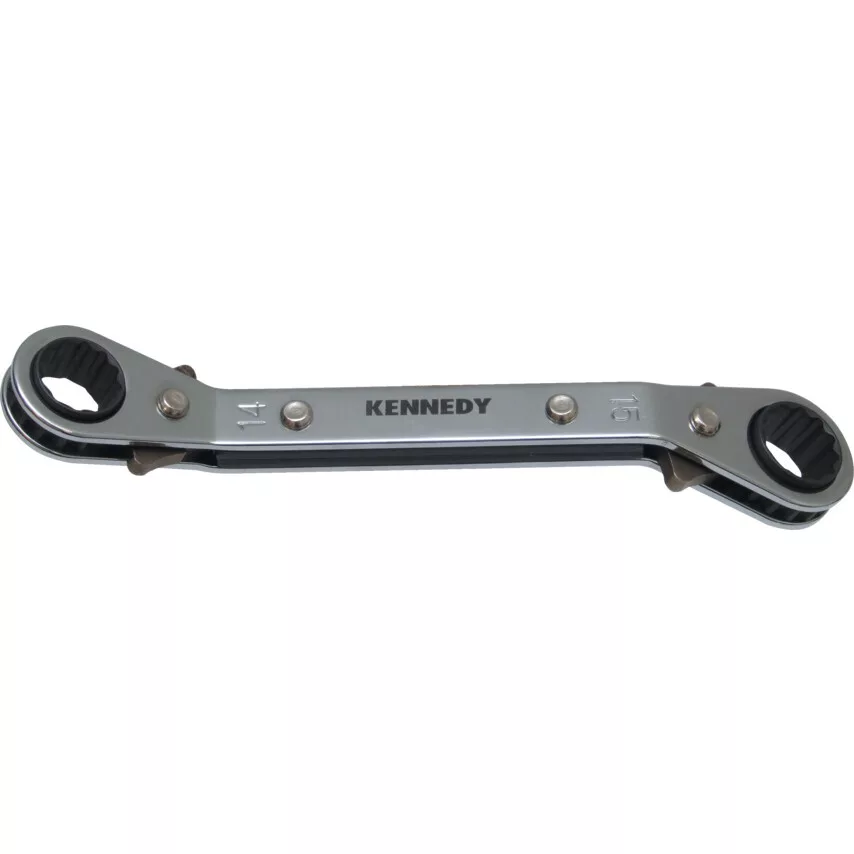 Racsnis zártkulcsok - 25°-ban hajlított, AF-colos. Króm-vanádium acélból gyártott kulcsok 12-szögű fejekkel Szűk helyekre tervezve Mindkét oldalon beépített racsnival a nagyobb termelékenység érdekében A racsnik forgásiránya a kulcs oldalán található irányváltókkal változtatható