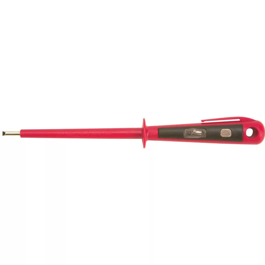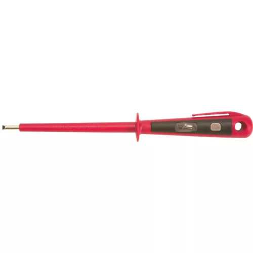 Fázisceruza. Vastag egybeöntött szigetelés a pengén és az átlátszó műanyag nyélen Alkalmas fázis vezeték keresésére 125-250 V feszültségnél 3 mm széles hegy Megfelel a VDE 0630 Part 4 előírásainak
