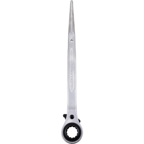 Racsnis szerelőkulcs. Króm-vanádium acélból gyártva Ipari összeszerelésekhez Racsnis így előnyös szoros helyekhez Megfordítható fej két belső 12 szögű mérettel Irányváltós nyél így a hajtási irány megfordítható a fej csavarról való levétele nélkül Kúpos végű nyél amely segít a rögzítő furatok egy vonalba állításában