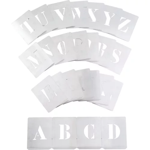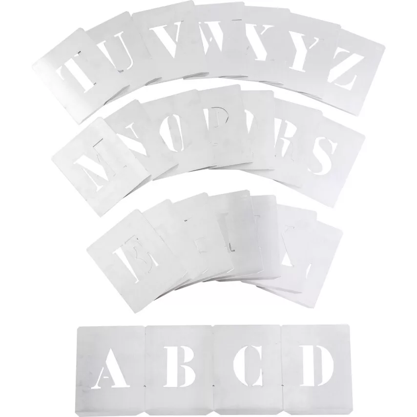 Festősablon készletek: A - Z. 26 darabos betűkészlet A - Z Kemény tartós acélból gyártva Precíz kivágások a jó minőségű és pontos jelölések érdekében Használhatók minden típusú festékkel illetve jelölőkeverékkel Ajánlott csomagolások jelöléséhez ki berakodó rámpák számozásához parkolókban a rendszámok felfestéséhez stb