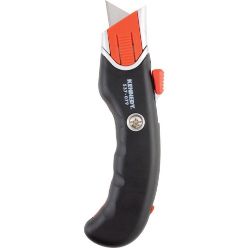 Kennedy - Auto-visszahúzódó penge kioldású biztonsági kés gyors kioldással. Használata kényelmes és könnyű automatikusan visszahúzódó pengével és két anyagból készült kényelmes fogóval rendelkezik Ugyanakkor a penge gyors kioldásával és a gyors kioldású penge tárolóegységével rendelkezik 4 pengével kerül leszállításra