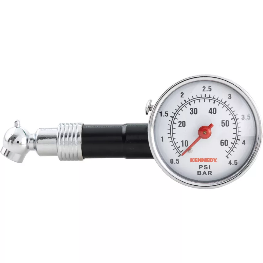 Gumiabroncs nyomásmérő. A biztonság érdekében a gumiabroncs nyomását hetente egyszer célszerű ellenőrizni hideg állapotban A gyártó ajánlása szerint Órás gumiabroncs nyomásmérő kettős psi bar skálabeosztással 64 psi 4 5 bar felső értékig A mért értéket a kioldó gomb megnyom ásáig tartja