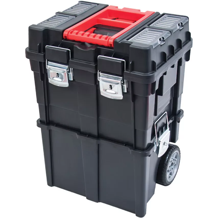Nagy igénybevételre tervezett, kompakt szerszámosláda. Négy az egyben rendező Nagy igénybevételre tervezett fogantyúk és fém zárószerkezetek Reteszes húzómarkolat Műanyag kerekek gumi védőréteggel Nagy szerszámtároló és mély szerszámtartó tálca a fedelén négy rendezővel és polikarbonát fedőlappal Méretek Ma x Szé x Mé 645 x 450 x 350 mm