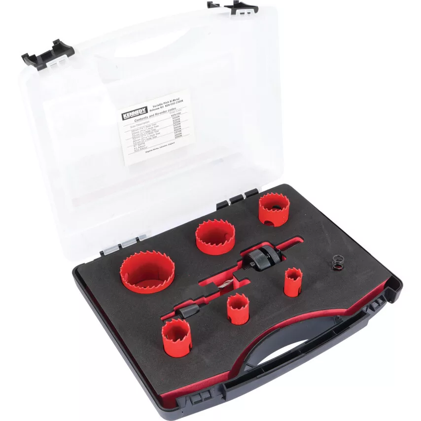 Váltott fogosztású bimetál lyukfűrész készletek - Villanyszerel' készlet. Jó min ségű lyukak készítéséhez fába acélba bronzba öntöttvasba alumíniumba és műanyagba Jellemz jük a nagyon agresszív forgácsolás mely sima vágási felületet és lényegesen alacsonyabb zajszintet eredményezmég olyan anyagok vágásánál is mint pl a csövek vagy sarokacélok stb 40 -kal gyorsabban vágnak mint a fix fogosztású fűrészek és forgácseltávolításuk is hatékonyabb Kevesebb er kifejtést igényelnek és élettartamuk is hosszabb akárcsak az akkumulátoroké hogyha akkus fúrógépekkel használjuk Használhatóak műhelyekben építkezéseken és karbantartási munkálatoknál Váltakozva 4 és 6 fog inch 28 5 mm 11 8 vágási mélység Villanyszerel készlet - 9 darabos Hat darab váltott fogosztású bimetál lyukfűrész edzett élekkel két felfogószár és egy kilök rugó Robusztus műanyag tárolódobozban Tartalom 16 20 25 32 40 és 51mm lyukfűrész K7 kilök rugó K1 és K10 tengelyek