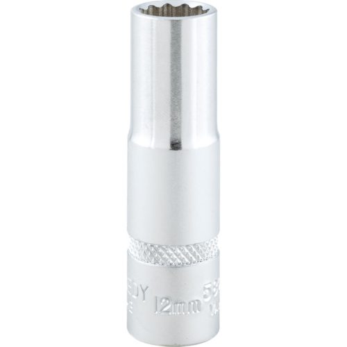 12-szögű hosszú dugókulcs fejek 3/8". 12 szögű kivitel amely nagyobb nyomatékot eredményez Krómozott polírozott króm-vanádium acél Belül letört élekkel a csavarfejekre való gyors ráfogás érdekében Bels négyszög minden oldala horonnyal