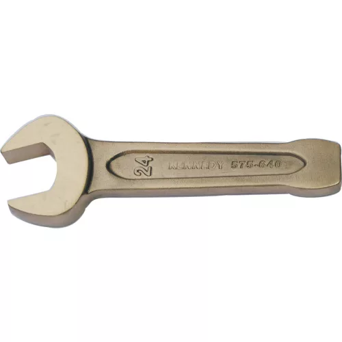 Alumínium-bronz szikramentes biztonsági szerszámok - Villás ütőkulcsok. A szikramentes szerszámokat azért használják hogy kizárják a véletlen tüzek vagy robbanások keletkezésének esélyét a tűz-vagy robbanásveszélyes munkahelyeken Ezek a szerszámok a normál kivitelű szerszámokkal ellentétben nem képeznek szikrát kemény felülethez történő ütés következtében A szikramentes szerszámok használata alapvetően fontos sok ipari alkalmazásnál úgymint vegyipar olajipar festékszóró fülkékben végzett műveletek hajózással kapcsolatos ipari műveletek bányászat papírgyártás vagy bármely más olyan munkaterület ahol gyúlékony gőzök vagy tűzveszélyes maradványanyagok vannak jelen Az alu-bronz szikramentes biztonsági szerszámok keménysége 25 HRC szakítószilárdságuk 75-85 kp mm2 A szikramentes biztonsági szerszámok karbantartását nagy körültekintéssel kell végezni rendszeres időközönként szükséges tisztítani újraélezni hogy eltávolítsuk az esetlegesen rárakódott vastartalmú anyagokat vagy más szennyeződéseket melyek ronthatják a szerszámok használati értékét Villás ütőkulcsok A lapos ütőfelület kalapáccsal üthető a nehezen oldható kötőelemek meglazítása vagy megszorítása céljából