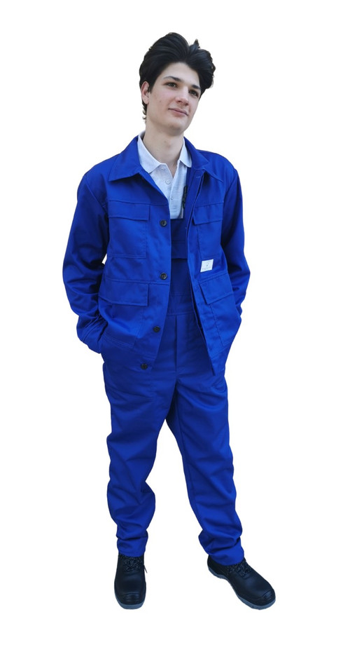 * királykék melles öltöny, 350 g/m2-es, lángmentesített, 100% pamut alapanyagú, minősített hő és láng ellen védő szövet* biztonsági varratok kettős lánc-, plusz 3 fonalas szegőöltéssel* MELLESNADRÁG (5SLMN220): állítható, gumibetétes vállpánt, magasított oldal, gumírozott hátrész, két függőleges nyílású biztonsági foltzseb és a mellrészen egy tépőzáras zsebfedővel rendelkező biztonsági zseb* KABÁT (5SLKA220): meghosszabbított dzseki fazon, több helyen reteszelt rejtett gombolás, négy rávarrt, tépőzáras zsebfedővel rendelkező, könnyebben használható biztonsági zseb, állítható mandzsetta