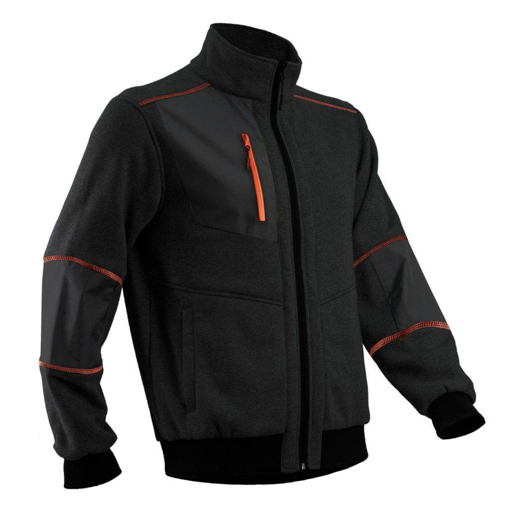 * Alapanyag: bolyhosított dzsörzé – 70% pamut+30% PES - 300 g/m2 vastag * PASSZÉ: bordázott és elasztikus 100% Poliészter* RIPSTOP BETÉT: (5 mm) PVC-vel borított 100% PES - 300 g/m2* Kopásálló Ripstop betétek a könyöknél* Álló gallér* Cipzáras záródás* 1 cipzáras kontraszt színű felső zseb* 2 függőleges oldalzseb* 2 belső zseb* Bordázott textil mandzsetta és aljrész* Kopásálló Ripstop megerősítés a könyökrészen