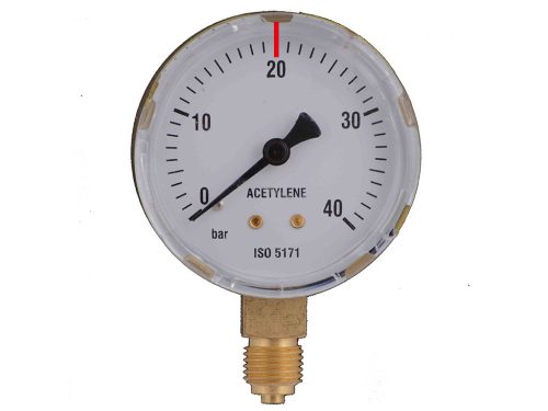 1/4"-os menettel, alumínium roppanógyűrűs tömítéssel ellátott 63 mm átmérőjű, acetilén manométer, 40/20 baros.