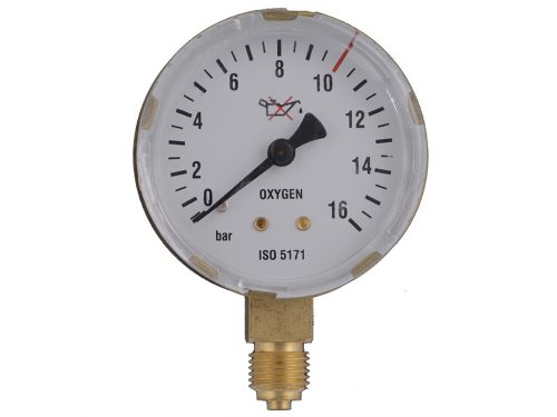 1/4"-os menettel, alumínium roppanógyűrűs tömítéssel ellátott 63 mm átmérőjű, oxigén manométer, 16/10 baros.