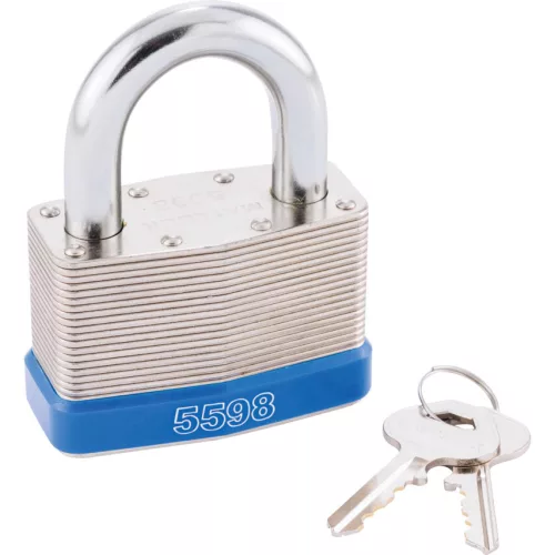 Laminált acél lakatok. Laminált acél test edzett acél kengyellel kettős reteszeléssel és 5 csapos hengerrel Beltéri vagy kültéri használatra közepes és maximális biztonság között A kulcs 1 000 db-onként változik 30 mm-nél 200db-onként MTL-950-9940K Nyerskulcs a 30mm-hez MTL-950-9950K Nyerskulcs a 40 - 65mm-hez