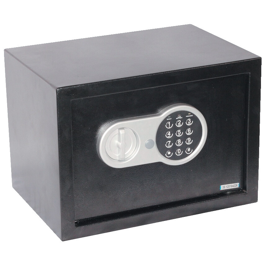 Elektronikus, digitális széf. Acélszéf elektronikus kombinációs zárral amely 3-8 számjegyű kóddal működik Jelzőfények jelzik a nyitott állapotot az alacsony töltöttséget és a figyelmeztetéseket 20 mm-es záróreteszek rejtett zsanérok és előre fúrt rögzítőpontok a padlóhoz való rögzítéshez Tartalmaz egy vészhelyzeti nyitókulcsot és egy padlóvédő szőnyeget Tökéletes kisméretű irodákba Tartalmazza a szerelvényeket 4 db AA típusú elemmel működik tartozék Méretek Külső ma x szé x mé 250 x 350 x 250 mm Belső ma x szé x mé 246 x 346 x 190 mm Tömeg 9 7 kg Méretek 250 x 350 x 250 mm