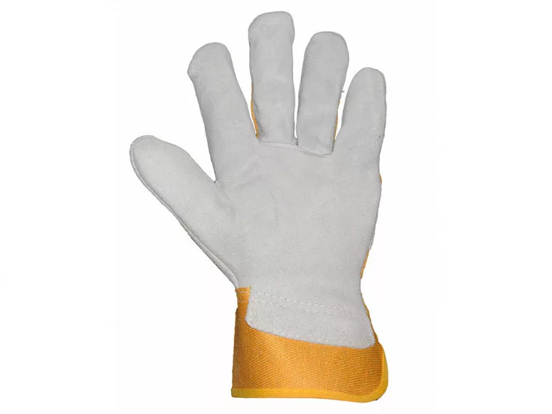 Ellenáll nagy igénybevételnek. Első osztályú, erős marhahasíték tenyér, aranyokker vászon kézhát és mandzsetta, erős varrás, tenyérnél belül puha pamut bélés. Artéria, köröm, és ökölcsont védővel ellátva. Méret: 10 Szín: Sárga Védelem: Mechanikai védelem Minősítés: EN388:4243 Csomagolás: 12 pár/csomag