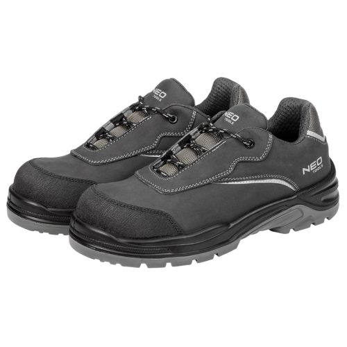 Munkacipő, S3 SRC, fém részektől mentes, hasított bőr, fokozottan ellenáll az átnedvesedésnek, fényvisszaverő betétek, rázkódást elnyelő csúszásgátló talp, kopásnak, olajnak, benzinnek és egyéb organikus hígítónak ellenálló két sűrűségű PU talp, 200J ütésnek ellenálló orrvédelem, átszúrásnak ellenálló kevlár betét, antielektrosztatikus betét, fényvisszaverő cérnával készült cipőfűző, Oxford szövettel megerősített cipőnyelv, S3 SRC kategóriájú, csúszásmentes, CE tanúsítvány, méret 46 A Neo S3 nubuk bőr munkacipő védi a lábat a hideg és a vízzel való átázás ellen. Nagyon kényelmesek, nem tartalmaz fémelemeket ezért a fémdetektorok számára észrevehetetlenné teszi őket. Jellemzők: rezgéscsillapító csúszásmentes talp, amely ellenáll kopásnak, az olajnak, a benzinnek és más egyéb vegyületeknek. Átszúrás elleni kevlár talp ami jó kopásállóságú. A cipő CE tanúsítvánnyal rendelkezik, megfelel az EN:ISO 20345:2011 szabványnak.