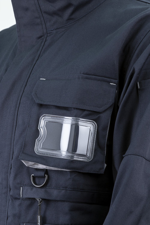 Twill: 60% pamut / 40% poliészter - 245 g/m2dzsekifazonú bikolor kabát tépőzárral állítható mandzsettávalállig érő húzózár, szennyeződésektől védő, tépőzáras cipzárfedővel, magas álló gallérbeépített névjegykártyatartóa betéttel azonos színű varrásokkét fedett rávarrt oldalzseb, két, cipzáras bebújós oldalzseb, egy fedett telefonzsebegy cipzáros, függőleges felső zseb, egy tolltartós felső zseb, egy rávarrt fedett felső zseb névjegykártyatartóvalegy vízszintes cipzáros zseb bal oldalon, egy tolltartós zseb a bal ujjonegy kitűzőtartó gyűrű